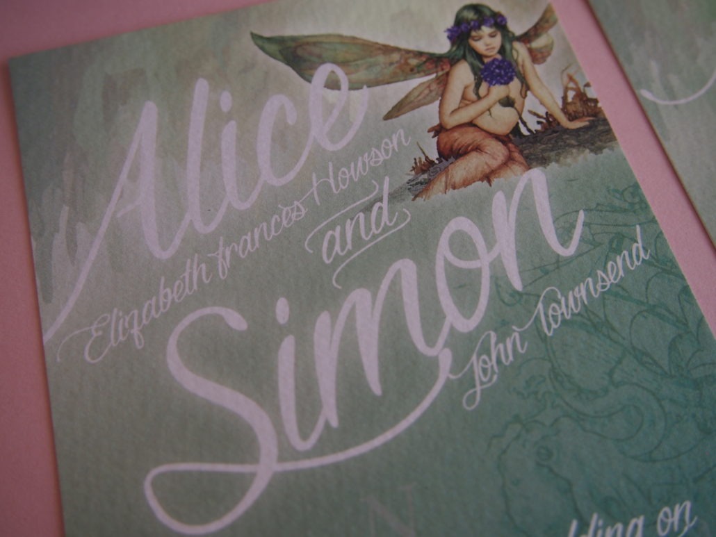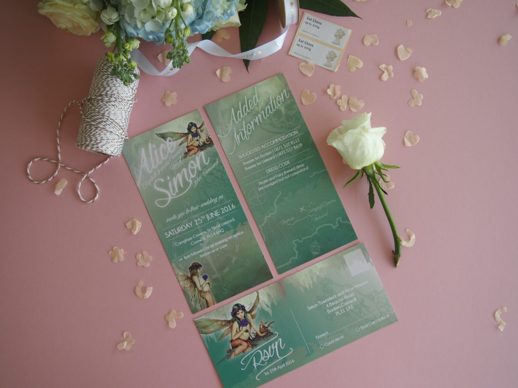 Alice & Simon briefed Ivy White to create something to suit their pirate and fairy themed wedding that was taking place in a cavern in Cornwall! They had asked for images of fairies with pirate themed touches and wanted them to include a green and purple colour palette. Such a fun project to work on.