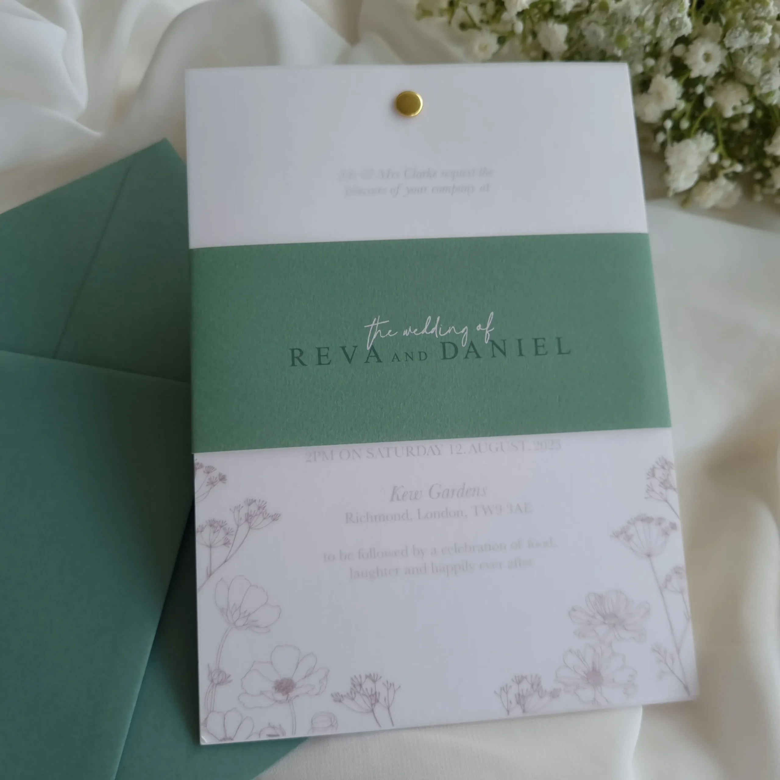 This design has a mix of textures and finishes sure to impress. The invitation set is printed onto a gorgeous fine Italian hammered card stock, which is satisfying to touch and perfect for bringing prestige to any print, Positioned on top of the invitation is a vellum cover with delicate illustrative wild flowers, softly showingthe mix of classic and contemporary fonts on the invite through. The set is finished with a gold rivet and printed belly band.