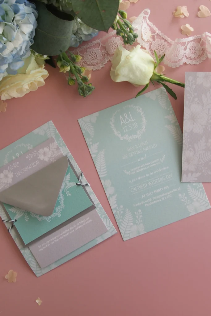 Inspired by the lace details on a Pronovias wedding dress. This gorgeous design is full of floral joys! The set includes a 5×7 invite, A6 additional information card, double-sided A7 RSVP card with metallic envelope, tied together with metallic twine. Available in any colour palette to suit your day. We recommend each piece is a different colour or shade to add to the layered effect.