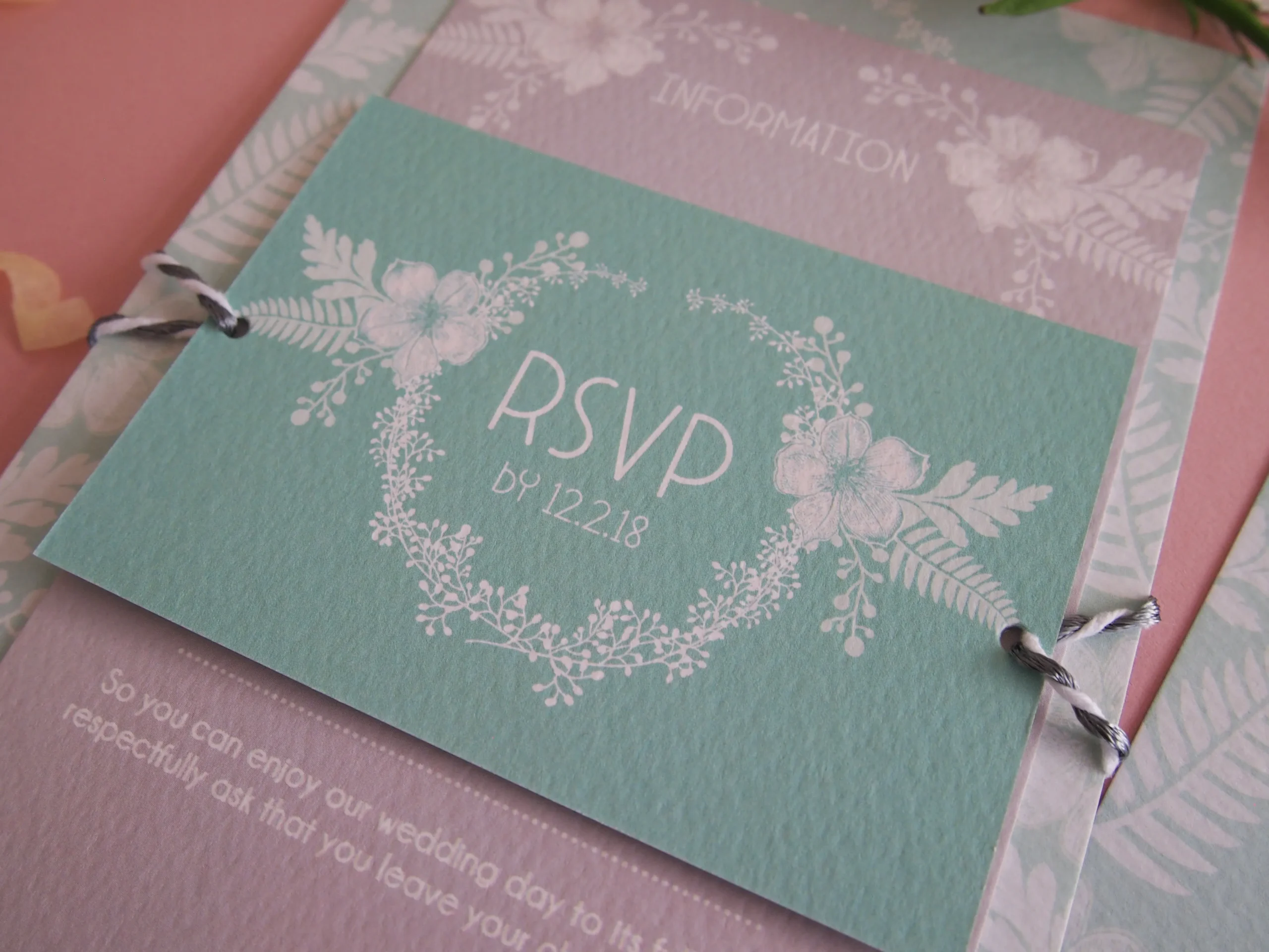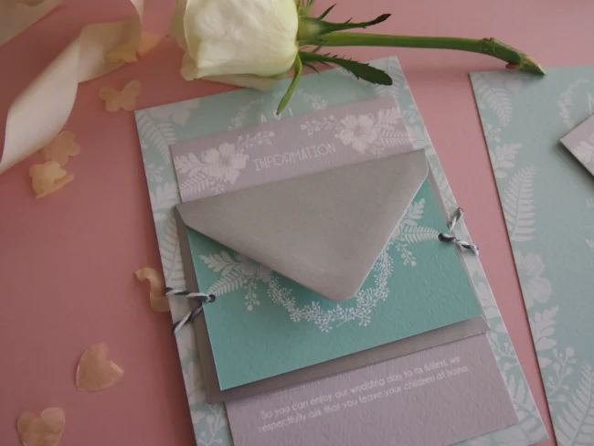 The invitation itself is printed onto a gorgeous fine Italian hammered card stock which is satisfying to touch and perfect for bringing prestige to any print. The invitation is supplied with a white envelope as standard, although coloured and metallic envelopes and envelope liners are also available. An additional information card contains all “The Details” your guests need to know about your special day such as accommodation, travel and gifts. The small RSVP card with metallic envelope is the perfect way for your guests to respond and whole set is beautifully bound together with metallic twine.