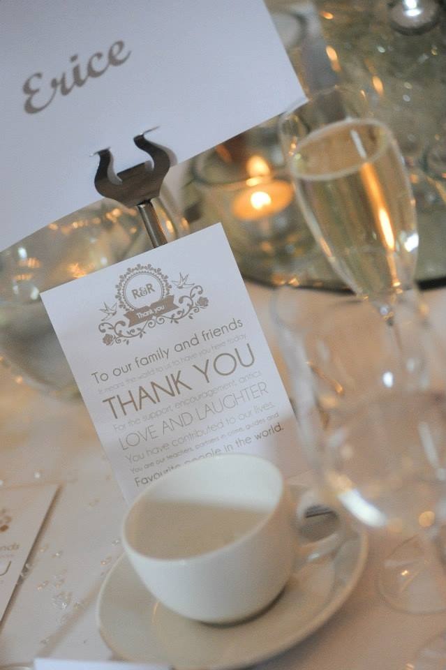 A stunningly, elegant letter pressed design on 900gsm hammered card, kept simple with just one colour, champagne. The on the day stationery followed which included fancy roll folded ceremony programs with a ‘for your tears of joy’ tissue holder and tissue. They also had signage, labels, a table plan, place thank you cards & table names.